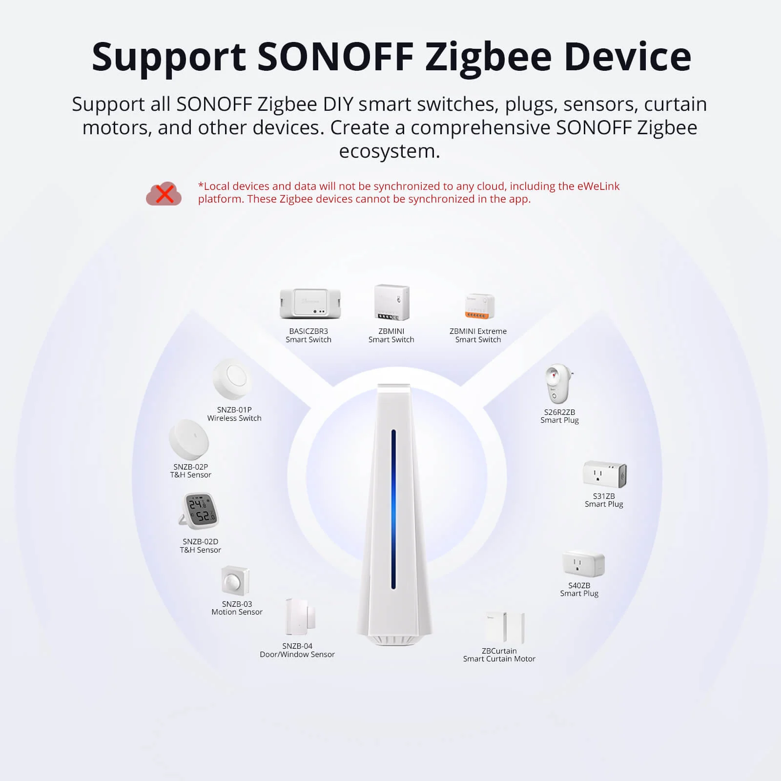 【Broad Compatibility】Fully compatible with Zigbee protocol devices and Wi-Fi LAN devices. Supports up to 128 Zigbee sub-devices, and can extend coverage using Zigbee routers. Integrates SONOFF LAN-compatible Wi-Fi devices via the eWeLink Smart Home add-on.